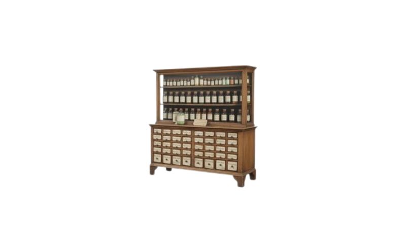 - Characteristics: Numerous labelled drawers, shallow depths, oak or walnut construction; may have a glass-fronted top for jars.