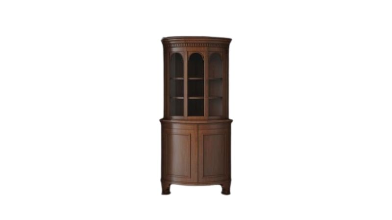 - Characteristics: Triangular or bow-front form, often glazed upper doors and solid lower doors; decorative veneers and inlay are common.