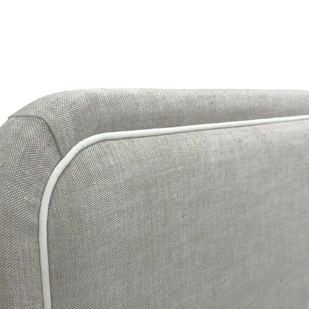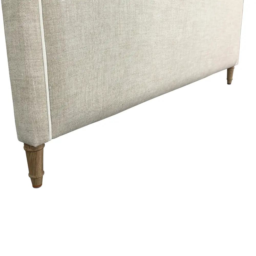The French Style Soft Upholstered Minimalist Headboard combines refined French lines with modern simplicity to create a timeless focal point for any bedroom. Upholstered in soft flax fabric, the padded panel features rounded corners and contrasting white piping for a clean, tailored profile. The headboard sits on turned oak legs finished in Weathered Oak #105 and is built on a solid wood frame for long-lasting stability. Designed as a Minimalist Headboard, it pairs effortlessly with contemporary or classic décor and is available with customizable finishes and eco-friendly material options for a personalized, responsible choice.