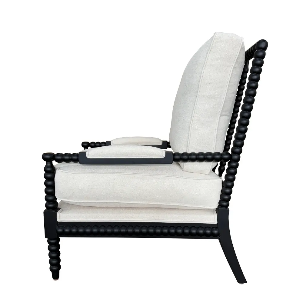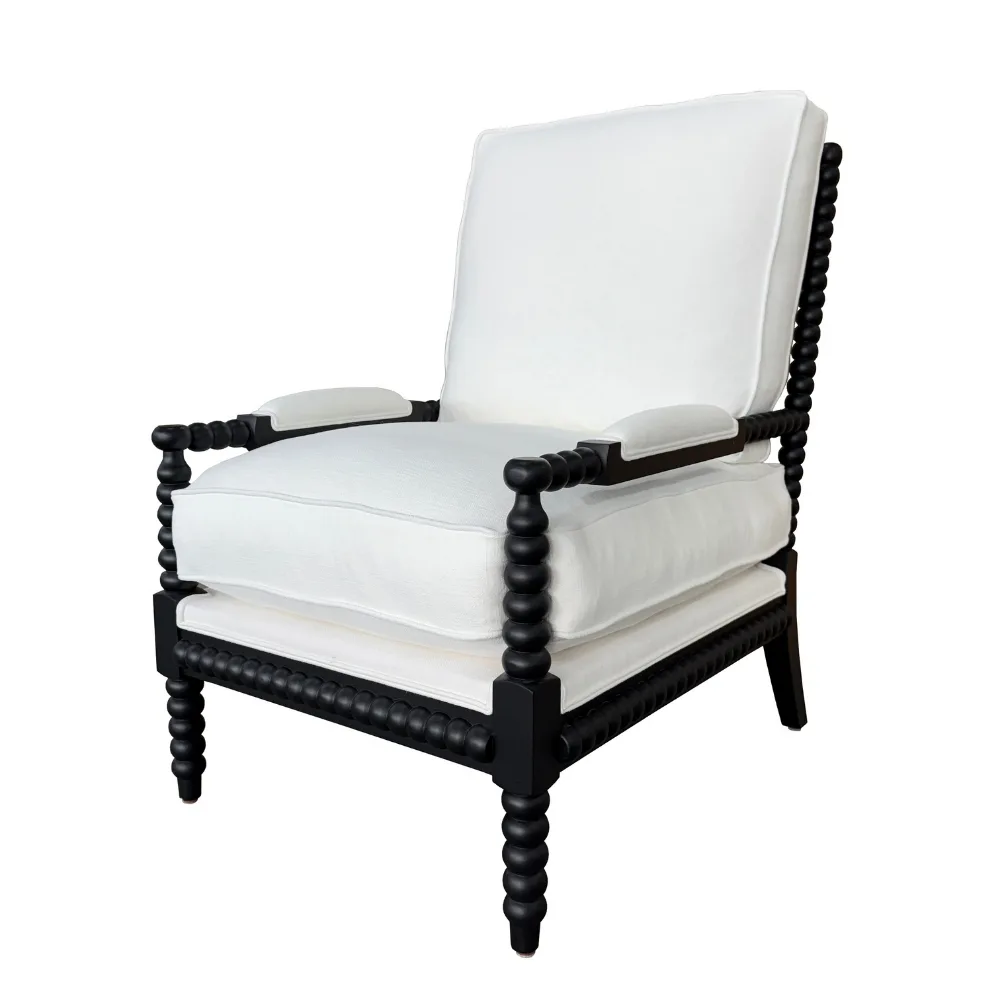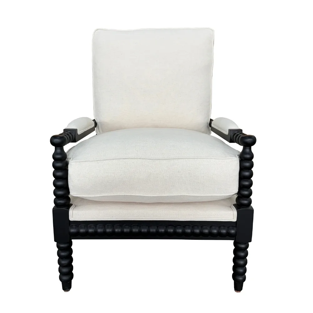 French Style White Birch Wood Spindle Accent Chair with Ottoman brings refined comfort and sculptural style to any living space. Designed for lounging, this Spindle Accent Chair pairs a generously padded seat and back cushion with a perfectly scaled ottoman for full‑body relaxation. The frame is crafted from solid birch wood, turned into distinctive spindle legs and arms that add architectural interest while ensuring long‑lasting stability. Neutral linen‑blend upholstery softens the bold silhouette and blends effortlessly with modern, coastal, or French‑provincial décor. A down‑blend, foam‑wrapped seat cushion delivers a plush yet supportive sit, while the loose back cushion invites hours of reading and conversation.